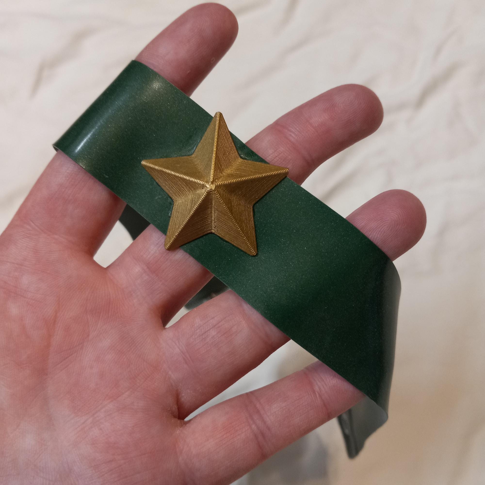 This latex choker has a gold 3D-printed star on the front and secures at the back of your neck with a snap.  The material is high quality latex sheeting, and it shines to a high gloss when treated with latex care products.