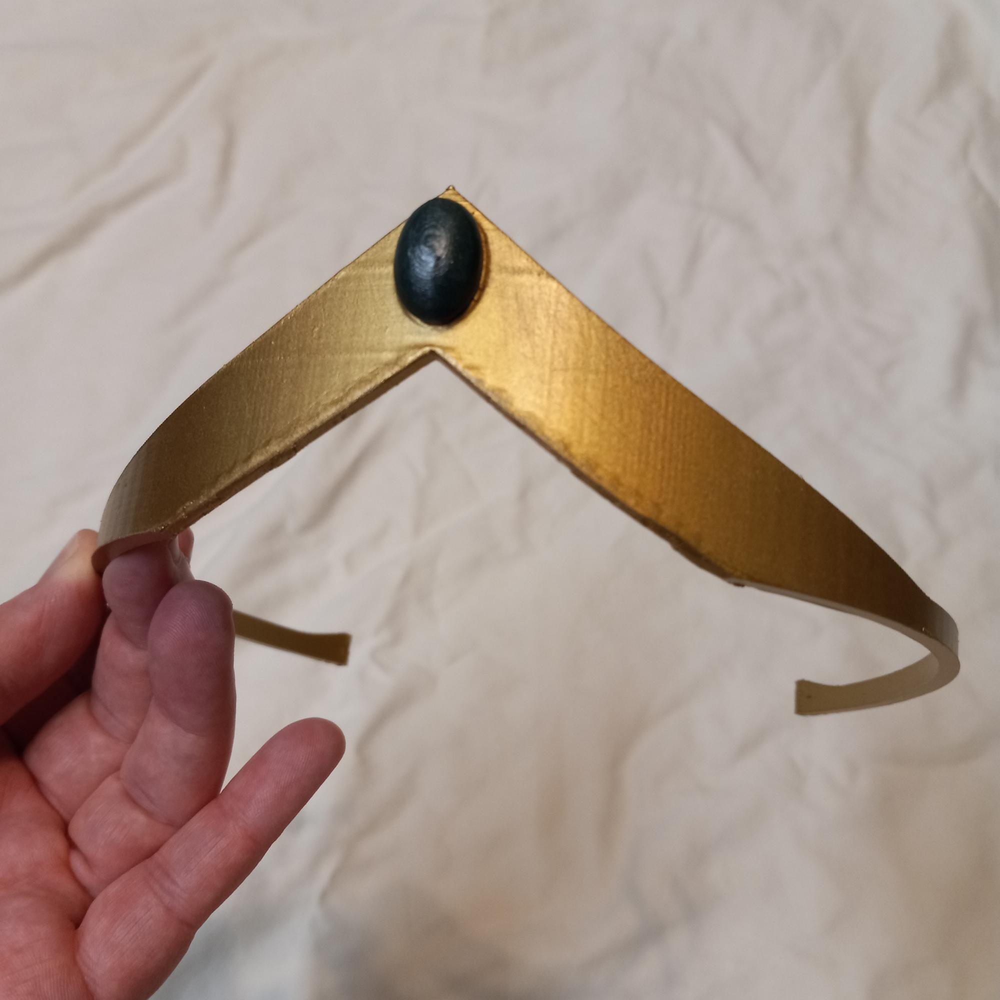 The tiara is 3D-printed in PLA filament, a biodegradable plastic, and then painted with acrylic paint.  The jewel can be painted in a variety of colors.